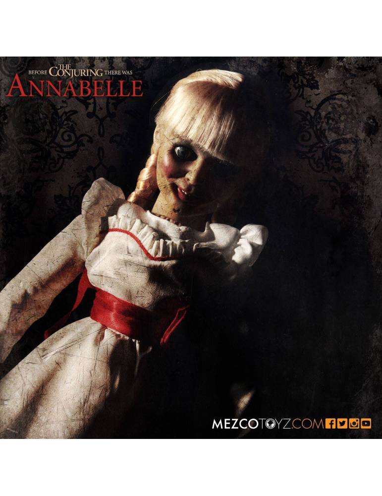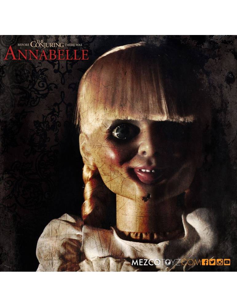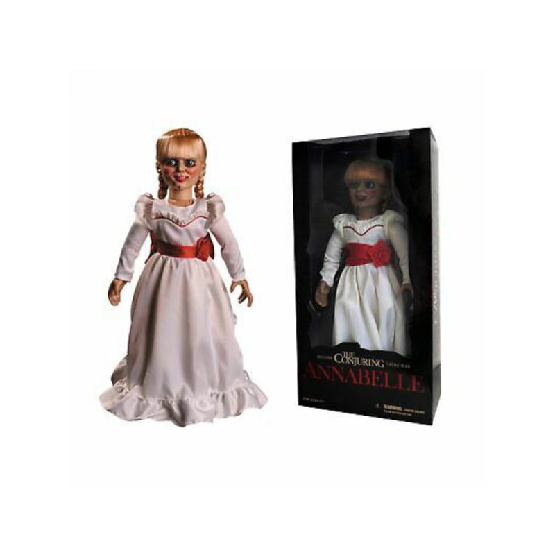 Articulated replica of the doll from the movie 'The Conjuring' with cloth clothes, size approx. 46 cm. Comes in a box with window.