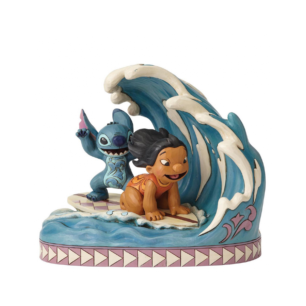 Jim Shore celebrates the 15th anniversary of the Disney classic Lilo and Stitch with this charming scene featuring the star-crossed heroes hanging ten in the Hawaiian surf. Packed in branded gift box. Not a toy or children's product. Intended for adults only. Height: 18.0cm