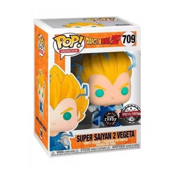 From the Dragon Ball Super collection, Vegeta Super Saiyan 2 (Glow Chase) Ex as a Pop! vinyl figure; the figure measures 9 cm and is sent in an illustrated box with a window; discover other figures from the Dragon Ball Z collection and collect them all.