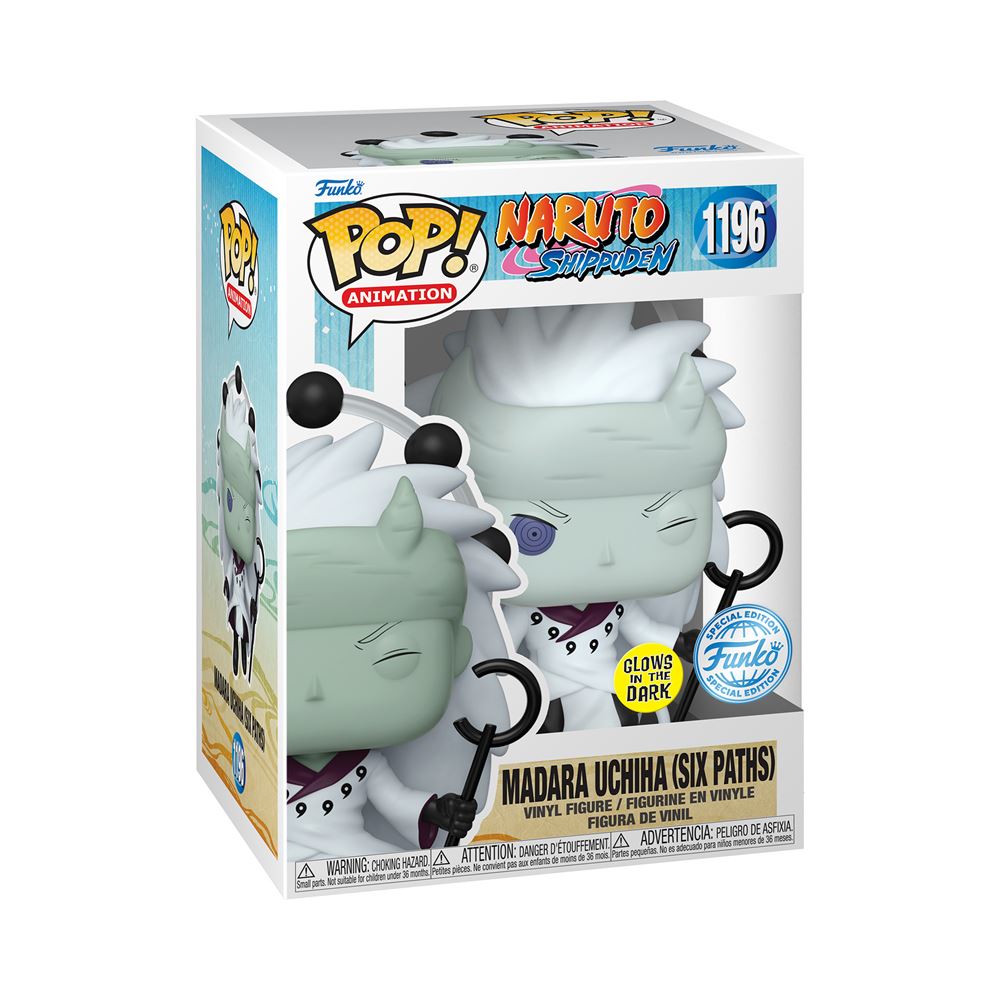 From the Naruto Shippuden collection, Madara Uchiha Six Path Sage (GITD) Ex as a Pop! vinyl figure; the figure measures 9 cm and is sent in an illustrated box with a window; discover other figures from the Naruto and collect them all.