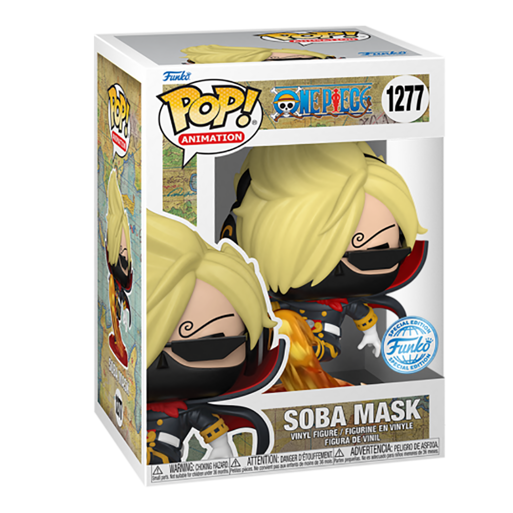 From the One Piece collection, Soba Mask Ex as a Pop! vinyl figure; the figure measures 9 cm and is sent in an illustrated box with a window; discover other figures from the One Piece collection and collect them all.
