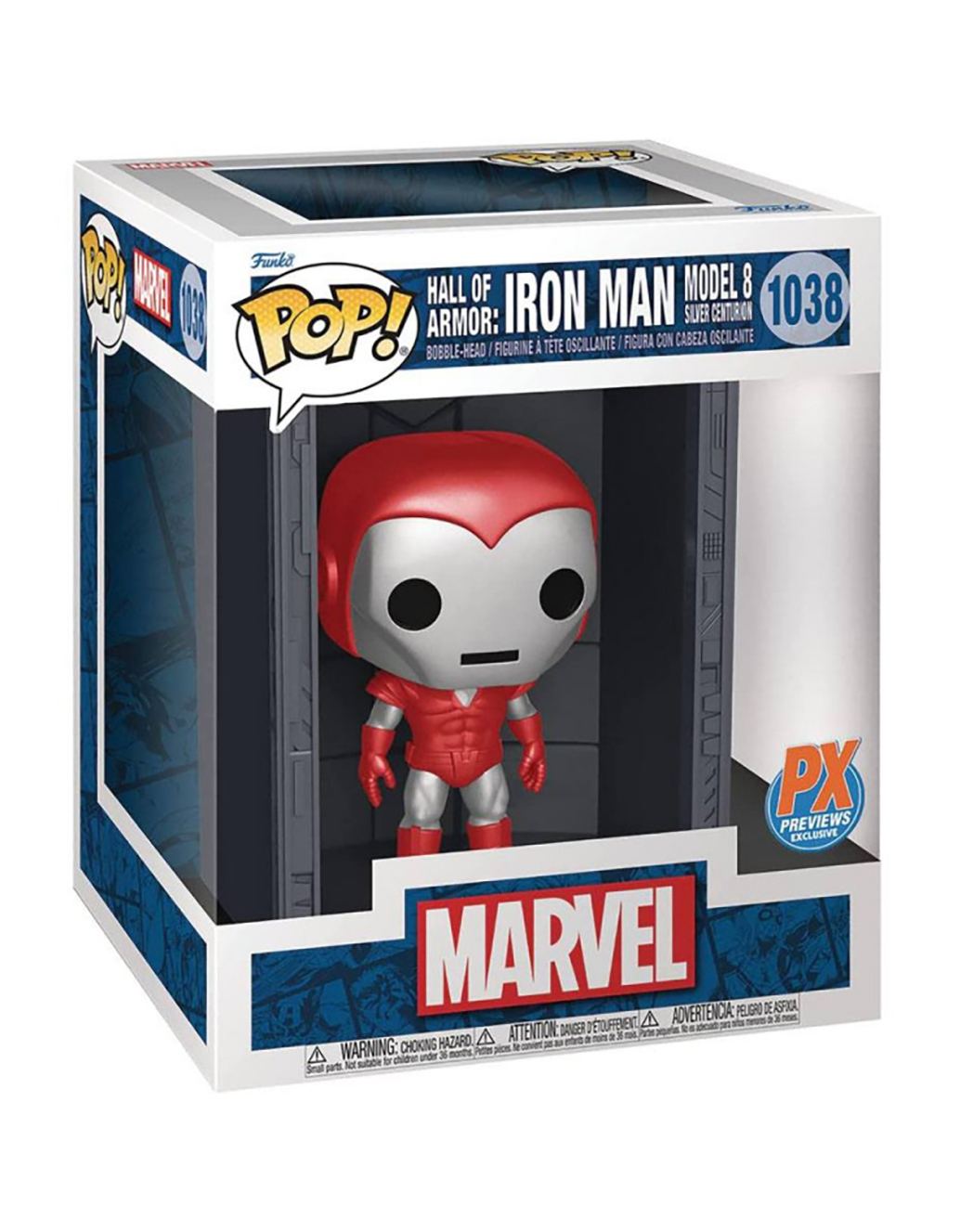 From the Marvel collection, Hall of Armor: Iron Man Model 8 Silver Centurion as a Pop! vinyl figure; the figure is sent in an illustrated box with a window; discover other figures from the Marvel collection and collect them all.