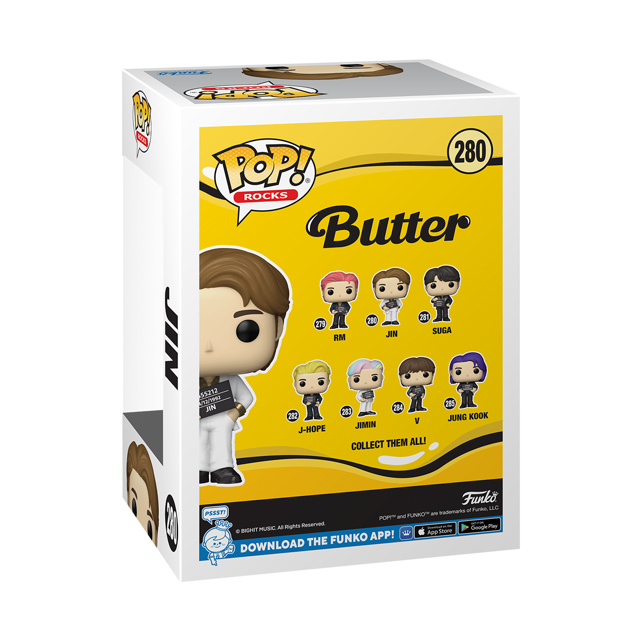 From the BTS Butter collection,Jin as a Pop! vinyl figure; the figure measures 9 cm and is sent in an illustrated box with a window; discover other figures from the BTS collection and collect them all.