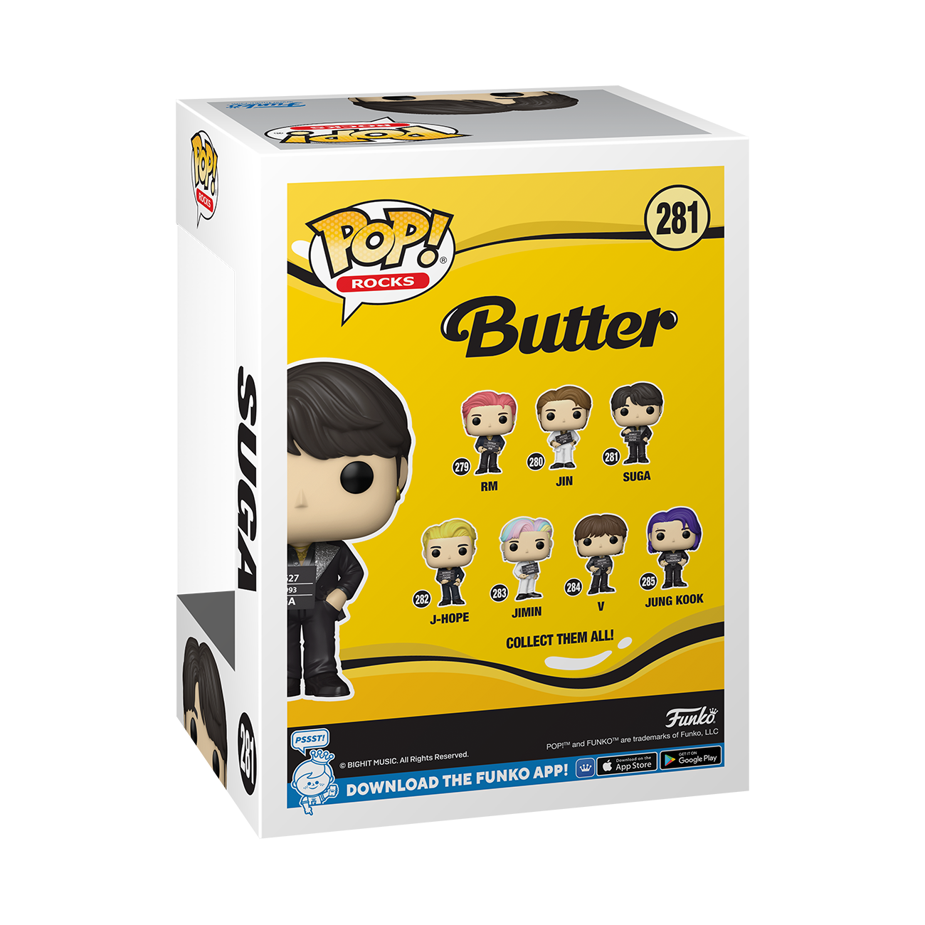 From the BTS Butter collection,Suga as a Pop! vinyl figure; the figure measures 9 cm and is sent in an illustrated box with a window; discover other figures from the BTS collection and collect them all.