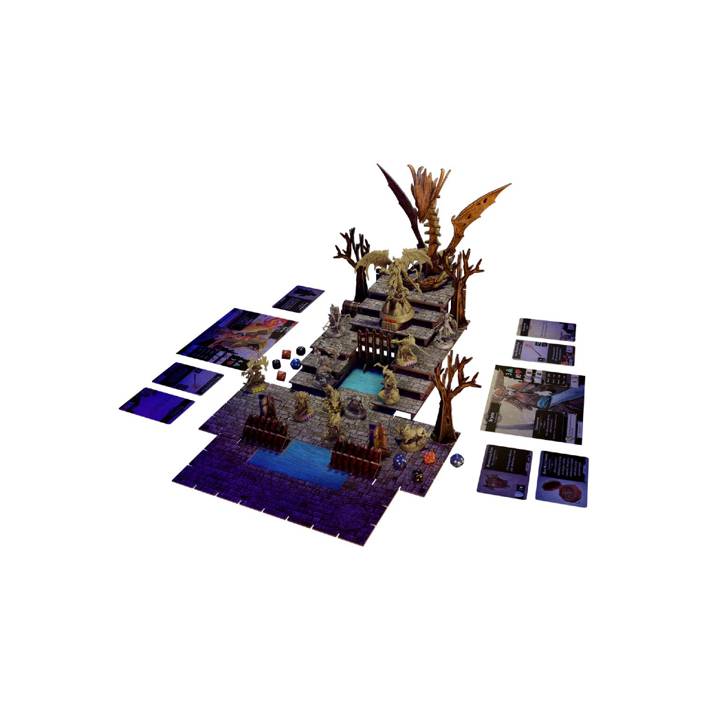 1 reglamento para aprender a jugar, 1 guía de ambientación, 1 guía de montaje, 12 dados especiales, 40 miniaturas, 16 indicadores identificativos, 18 piezas de tablero, 47 elementos de terreno, 6 capas inferiores, 6 cartas de Héroe, 40 cartas de Arma, 18 cartas de Armadura, 12 cartas de Accesorio, 42 cartas de Consumible, 42 cartas de Habilidad, 10 cartas de Dolencia, 4 cartas de referencia, 4 diales de Vida, 12 fichas de Exploración/Vista, 80 fichas de Estado, 54 fichas de Fatiga y 8 fundas de cartas.