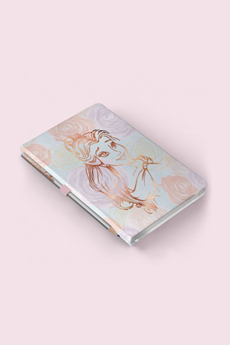 Cuaderno de tapa dura con 200 páginas. Lápiz incluido. Detalle en los bordes de la hoja en oro.