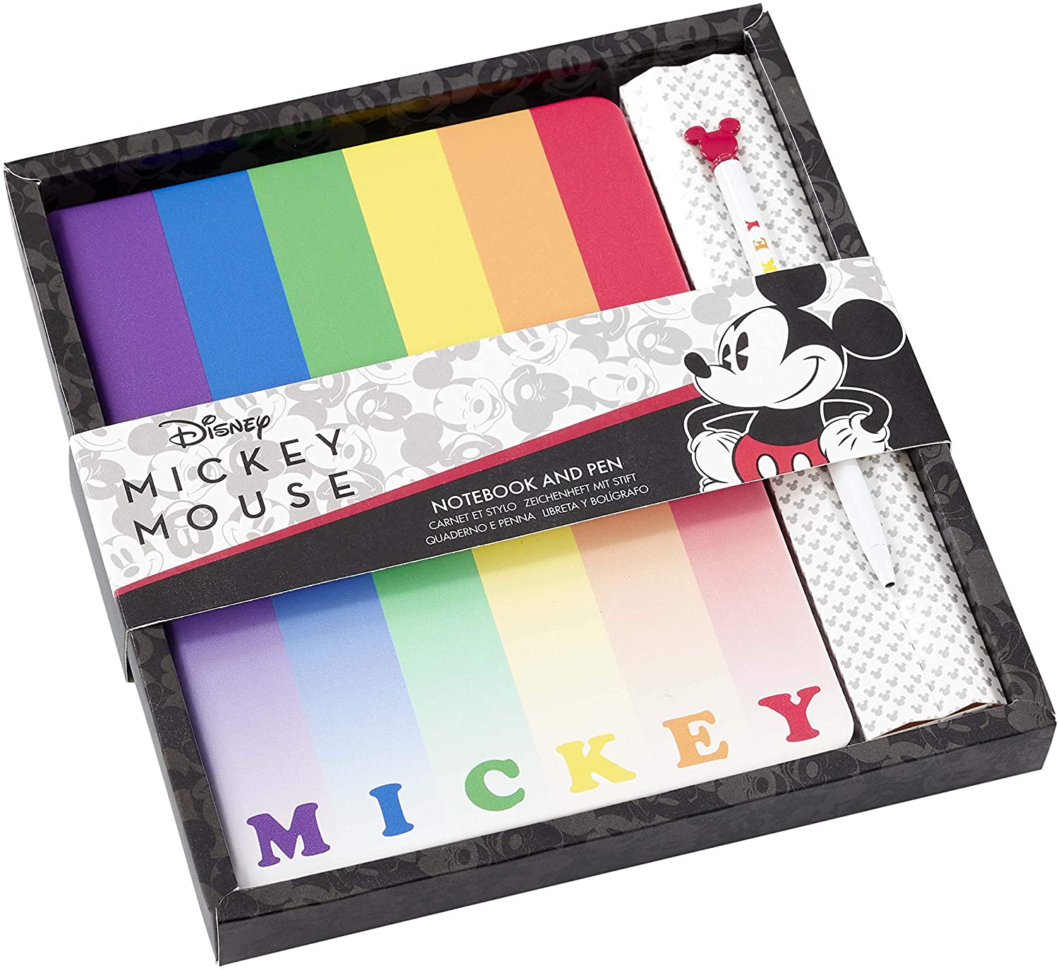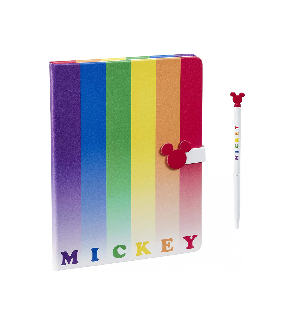 - Libreta tamaño A5 de tapa dura con rayas de arcoíris y el texto ''Mickey''