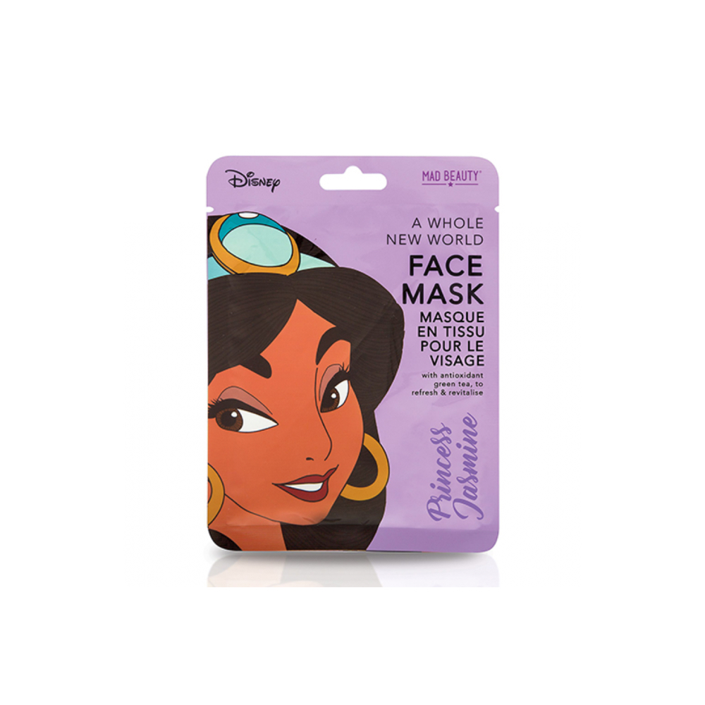 Mascarilla Facial Jasmine A whole new world de Mad Beauty contiene antioxidantes de té verde, que revitalizan la piel y deja una sensación de frescura, extracto de pepino, el cual ayuda a refrescar la piel, ácido cítrico para revitalizar la piel, Verdolaga con un efecto antiinflamatorio, granada con un efecto antioxidante y Aloe Vera que es un perfecto calmante para el rostro.