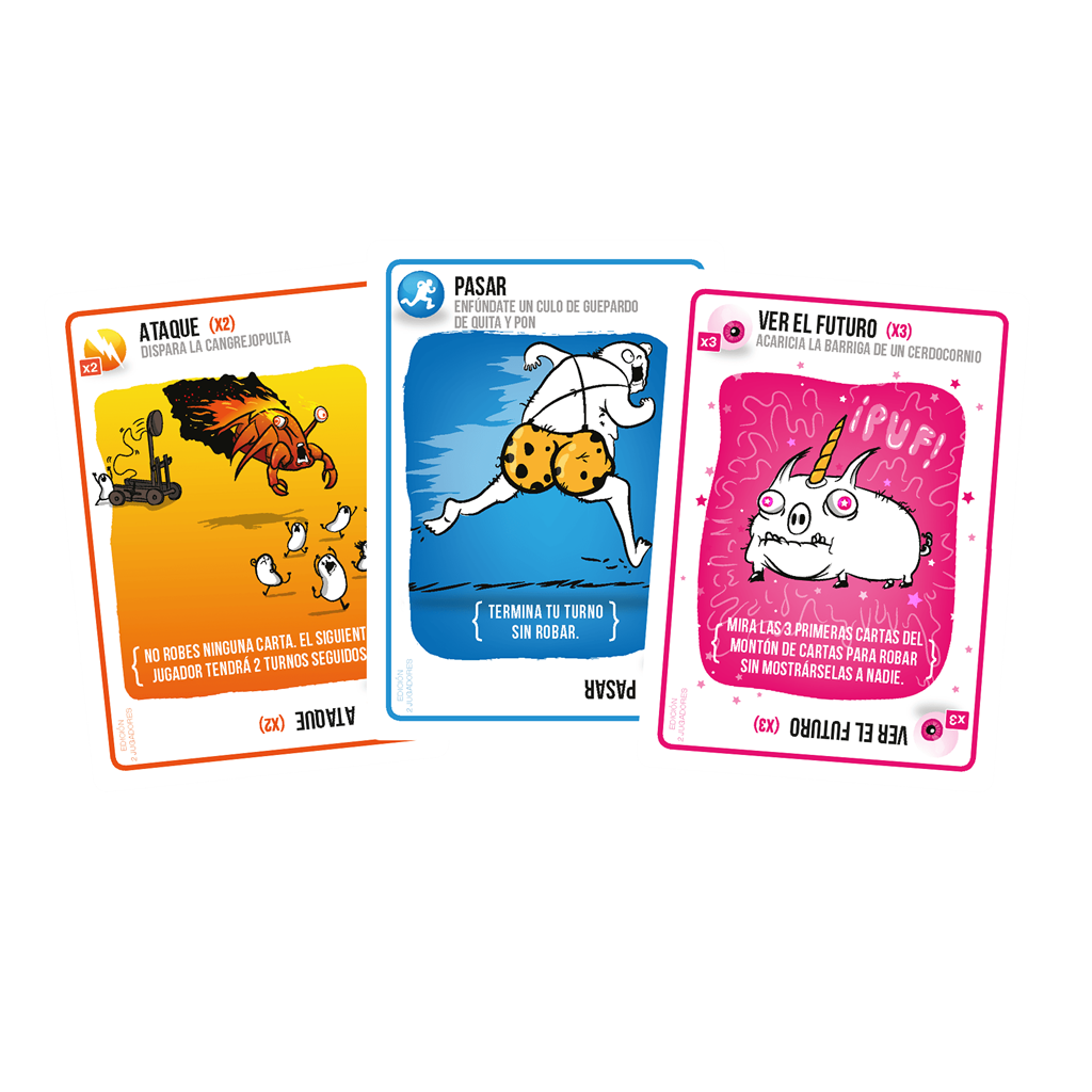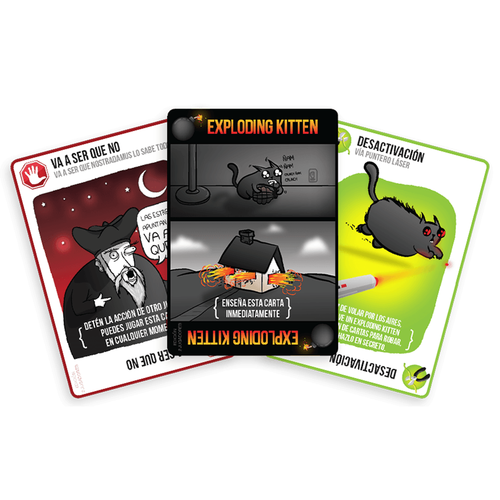 Cómo jugar: los jugadores roban cartas hasta que alguien robe al Exploding Kitten momento en el que explota y pierde la partida. A no ser que pueda desactivar al gato con cosas como un puntero láser o frotándole la barriga. Usa cartas de acción para pasar tu turno, para mirar en secreto una carta antes de robarla o para forzar a tu oponente a robar en vez de robar tú.