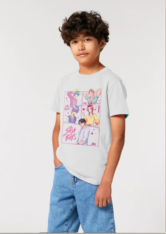 Luce un estilo diferente con esta camiseta Made in Japan, diseñada con un colorido estampado en la parte trasera que reúne a un grupo de cinco personajes ilustrados con estética vibrante y juvenil. Cada figura aparece enmarcada en un recuadro al estilo cómic, destacando por su personalidad y colores llamativos.