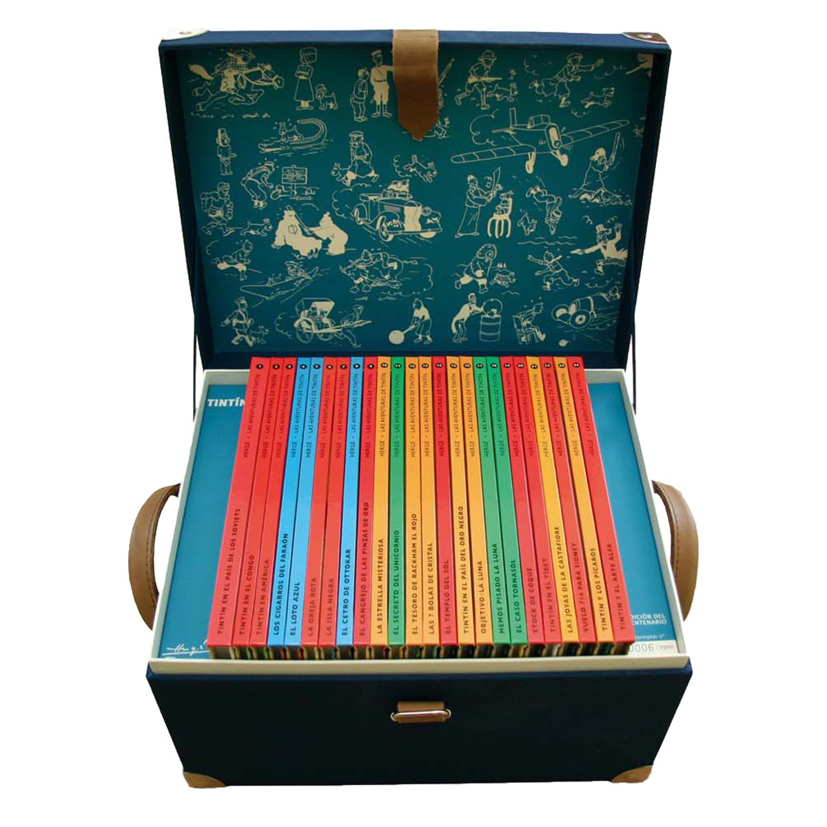 Para conmemorar los 100 años del nacimiento de Hergé, presentamos Las aventuras de Tintin Edición del Centenario una auténtica joya de coleccionista formada por un Cofre que contiene la colección completa de TINTIN formada por 24 títulos: 1. Tintin en el País de los Soviets; 2. Tintin en el Congo; 3. Tintin en América; 4. Los Cigarros del Faraón; 5. El Loto Azul; 6. La oreja rota; 7. La isla negra; 8. El cetro de Ottokar; 9. El cangrejo de las pinzas de oro; 10. La estrella misteriosa; 11. El secreto del Unicornio; 12. El tesoro de Rackham el Rojo; 13. Las 7 bolas de cristal; 14. El templo del sol; 15. Tinin en el país del oro negro; 16. Objetivo: la Luna; 17. Hemos pisado la Luna; 18. El caso Tornasol; 19. Stock de coque; 20. Tintin en el Tíbet; 21. Las joyas de la Castafiore; 22. Vuelo 714 para Sidney; 23. Tintin y los pícaros; 24. Tintin y el Arte Alfa.