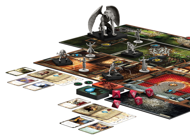 Contenido: 2 cuadernos de reglas, 24 módulos de tablero, 8 cartas y miniaturas de Investigador, 40 cartas de Objeto común, 24 cartas de Objeto único, 30 cartas de Hechizo, 37 cartas de Estado, 40 cartas de Daño , 40 cartas de Horror, 24 indicadores y miniaturas de Monstruo, 16 fichas de Búsqueda/Interacción, 16 fichas de Exploración/Vistazo, 22 fichas de Personaje , 4 fichas de Obstrucción, 4 fichas de Pasadizo secreto, 18 fichas de Fuego/Oscuridad, 8 fichas de Pared, 4 fichas de Puerta, 26 fichas de Pista, 6 fichas de Identificación, 5 dados. El kit de conversión contiene 16 cartas de Investigador, 33 indicadores de Monstruo y 4 fichas de Personaje.