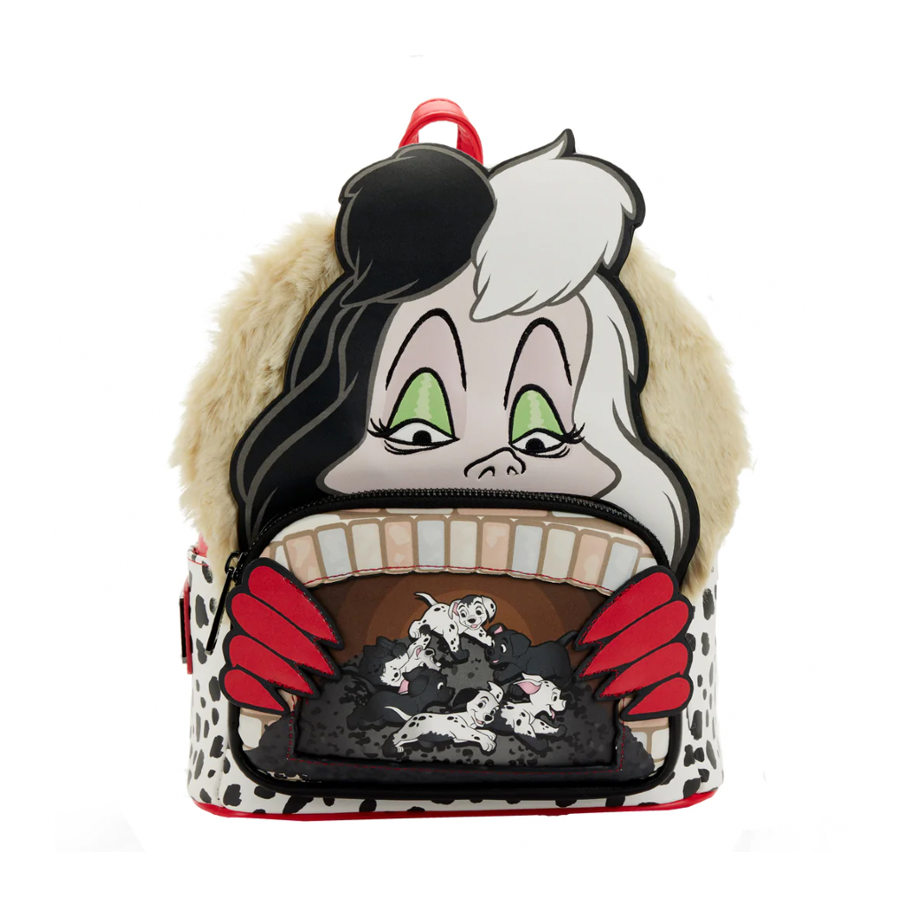 Mochila del increíble fabricante Loungefly hecha en piel sintética con asas y cremallera con detalles de Cruella de Vil de la película 101 Dálmatas