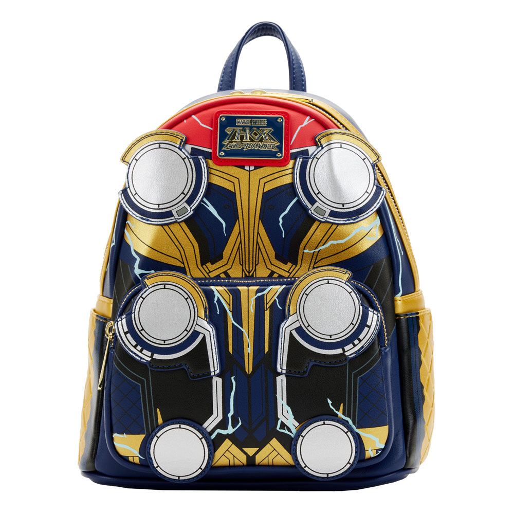 Mochila del increíble fabricante Loungefly hecha en piel sintética con asas y cremallera con detalles de Thor de la película Thor Love & Thunder. La mochila brilla en la oscuridad