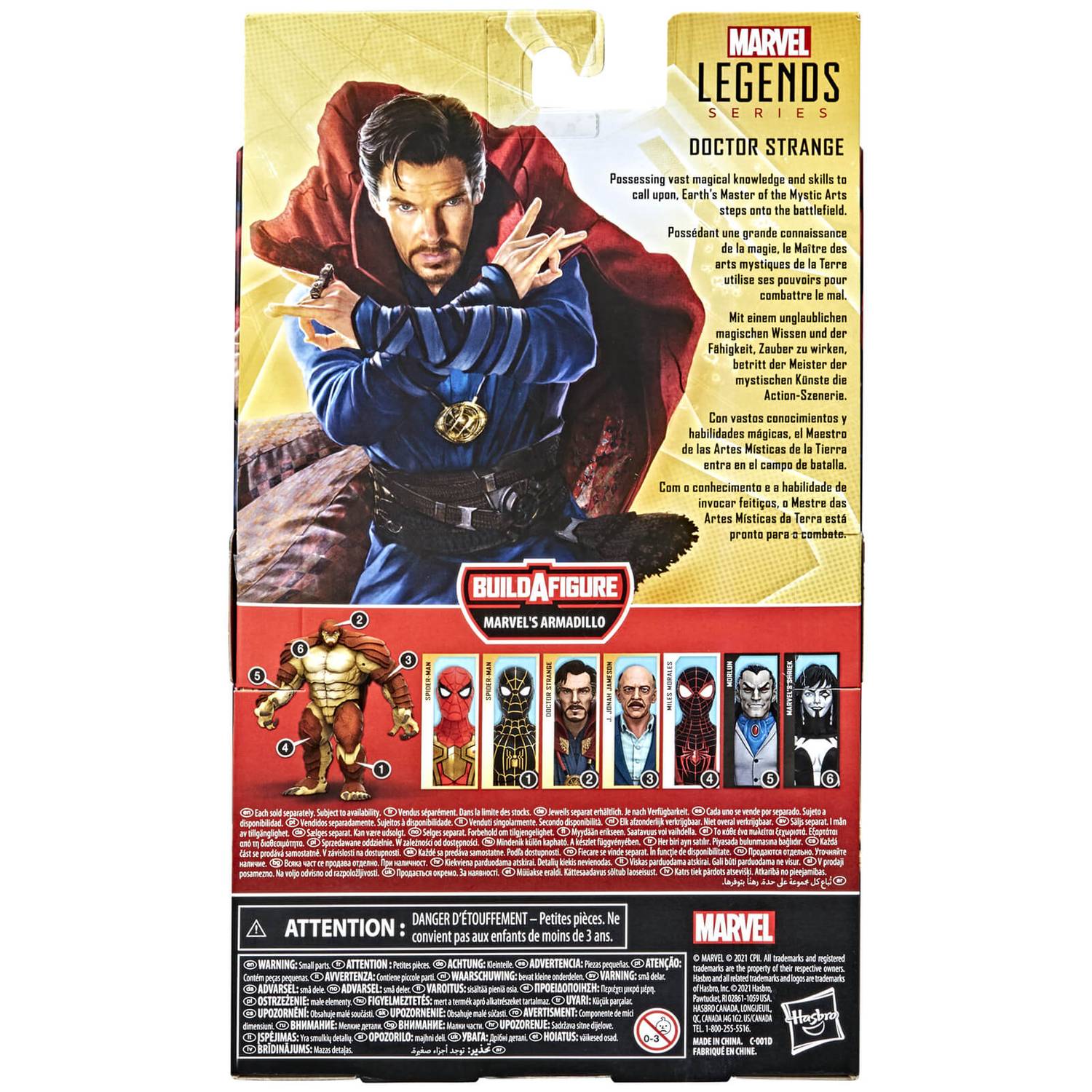 Hasbro presenta dentro de la colección Marvel Legends la figura de Dr. Strange, basado en su apariencia en la película Spiderman No Way Home. Se trata de una figura hecha en PVC con múltiples puntos de articulación. Incluye 2x manos opcionales, 2x efectos de escudo y una parte de la figura del Armadillo.