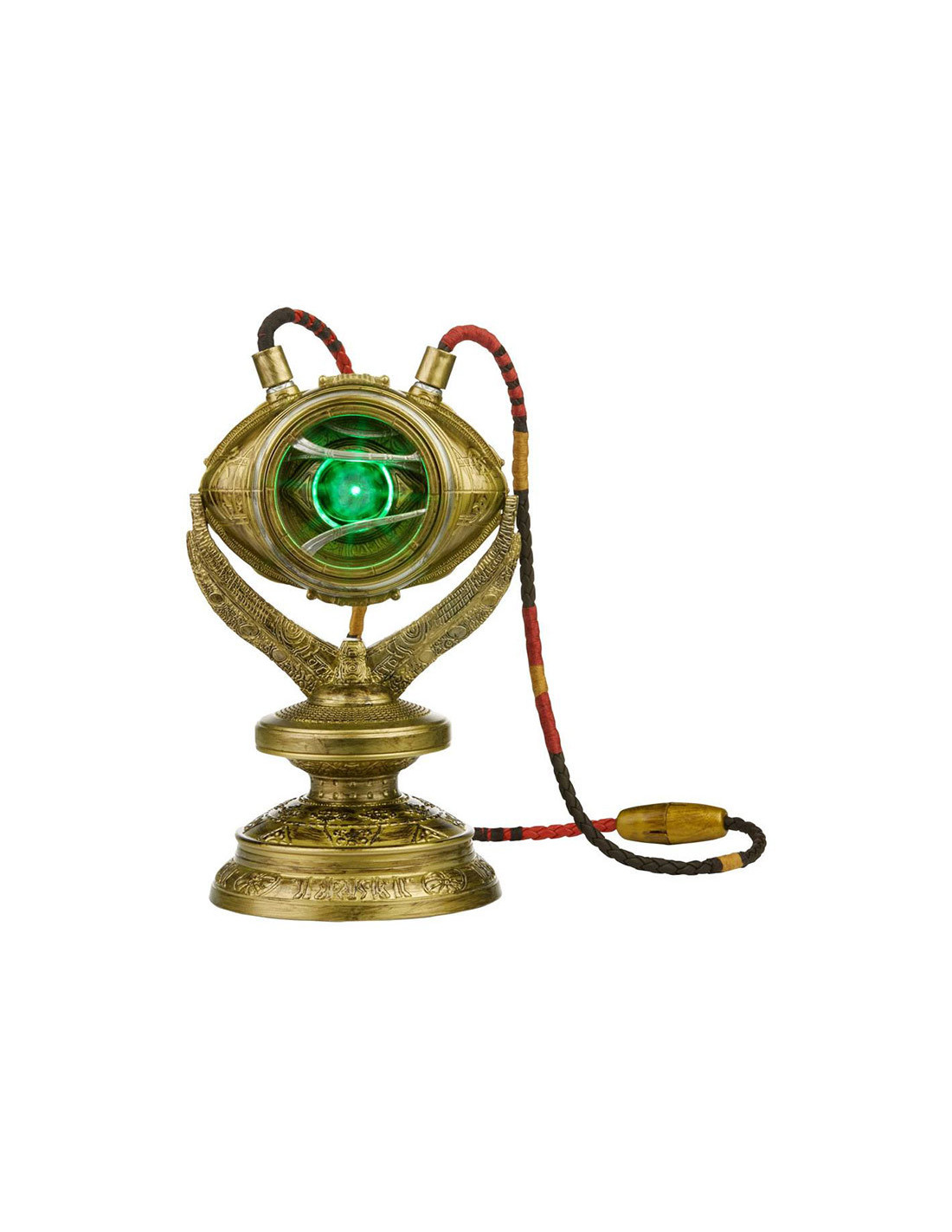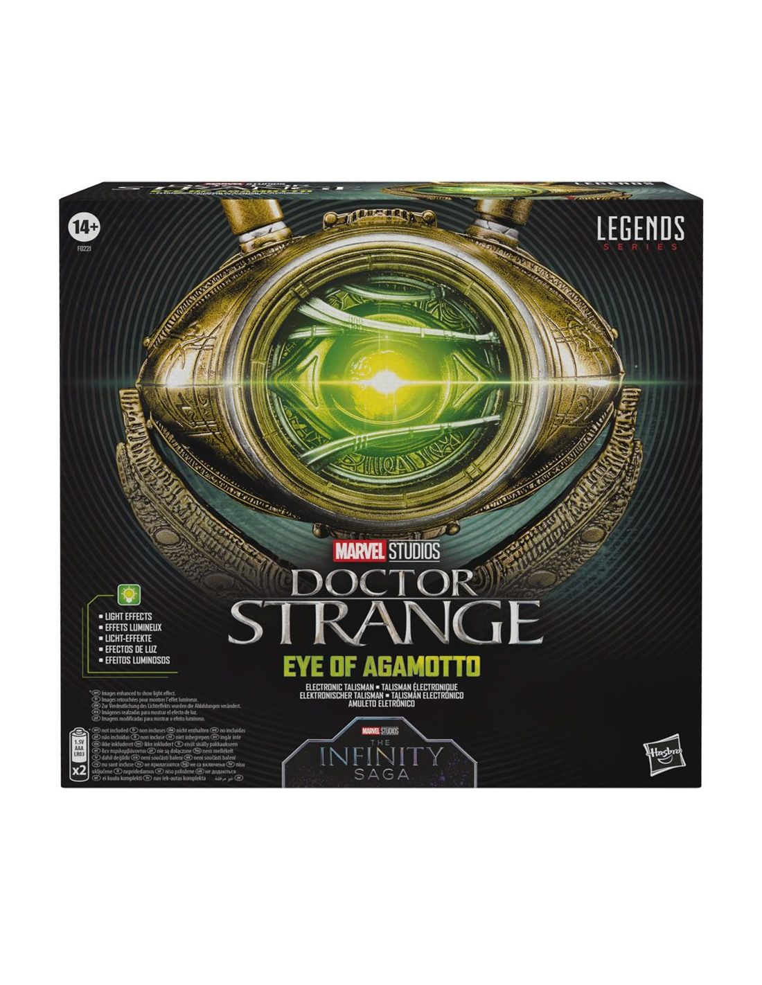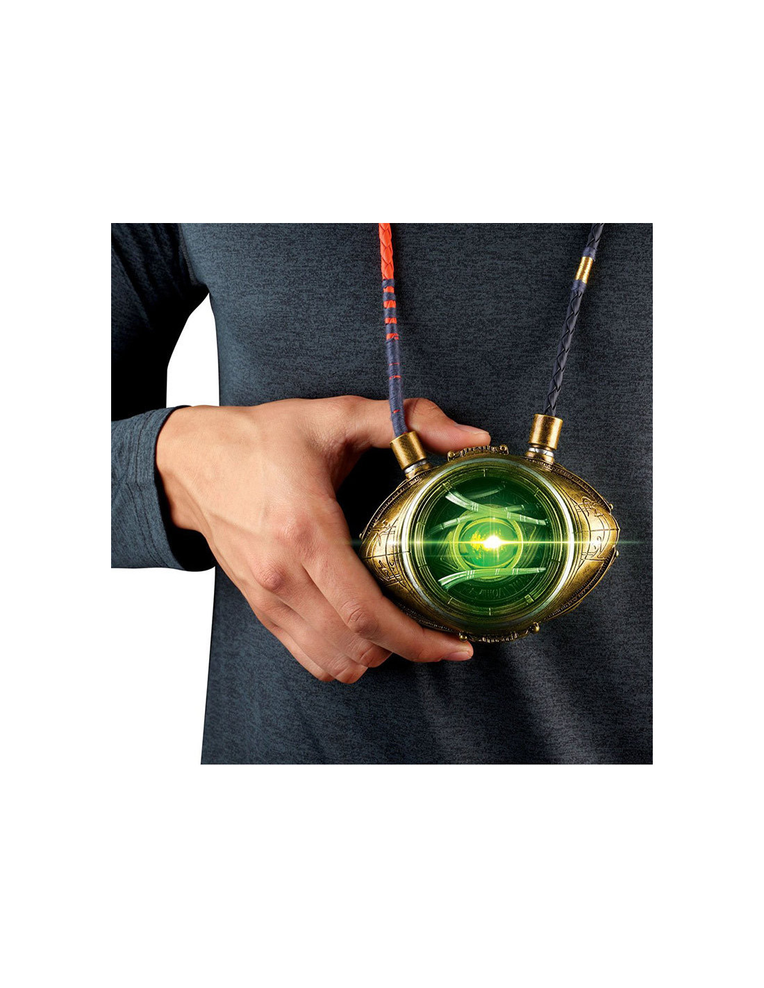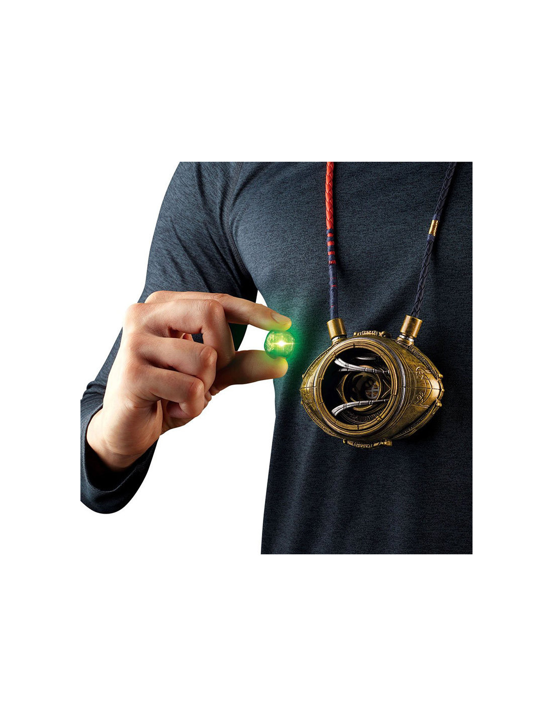 Hasbro Fans presenta esta réplica electrónica del Ojo de Agamotto, el mítico objeto de poder que está en poder del Hechicero Supremo. Se trata de una réplica hecha en PVC a escala 1:1 que permite a su poseedor controlar la Gema del Tiempo. Esta réplica está basada en el diseño del poderoso talismán que el Doctor Extraño utiliza en la película. Brilla con luz LED verde y puede colgarse al cuello. Incluye instrucciones. *Requiere 3x Pilas 1.5V AA ALKALINE (no incluidas).