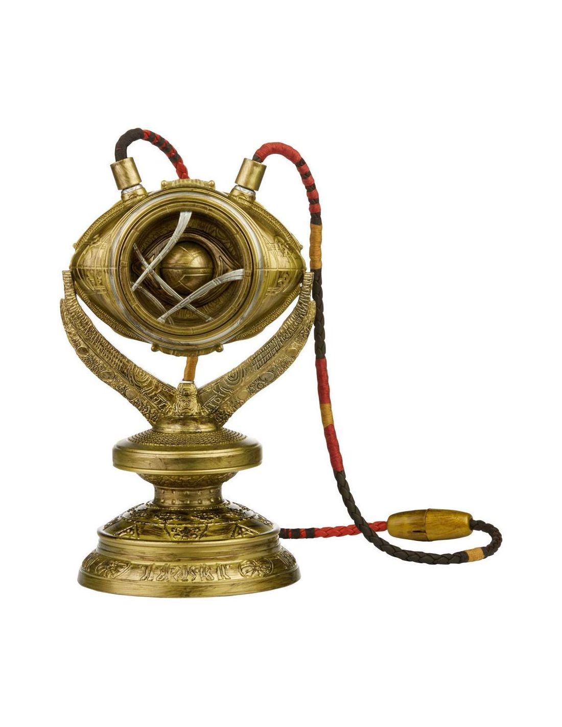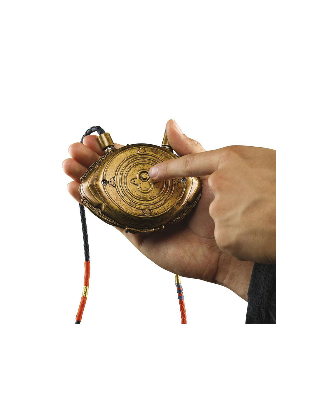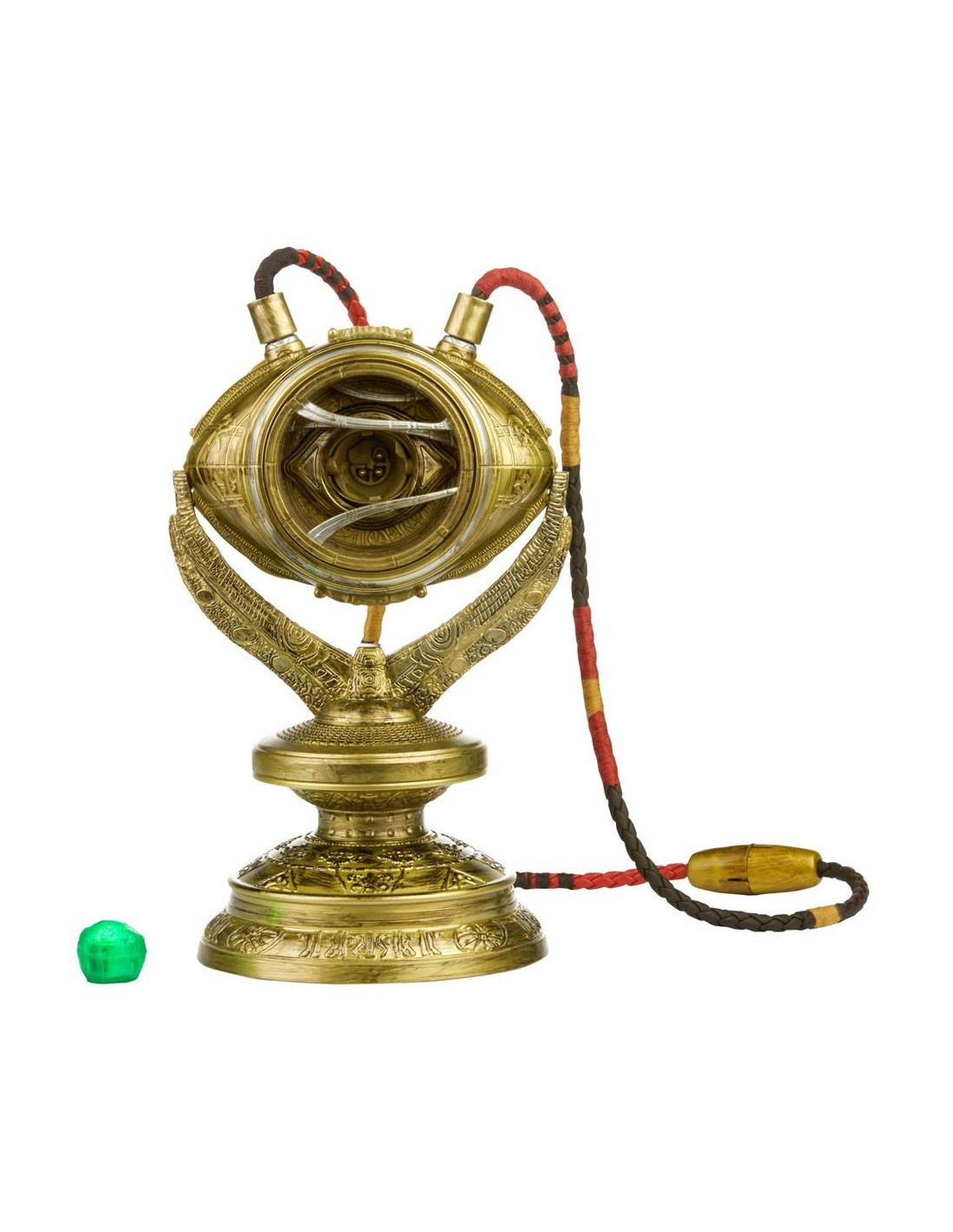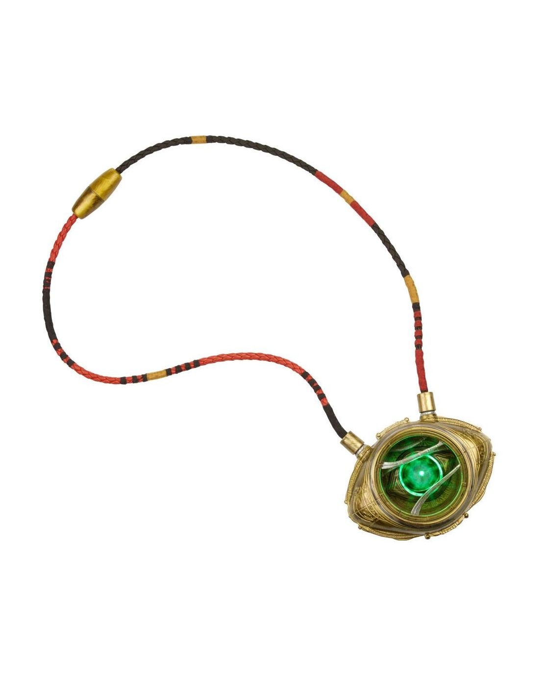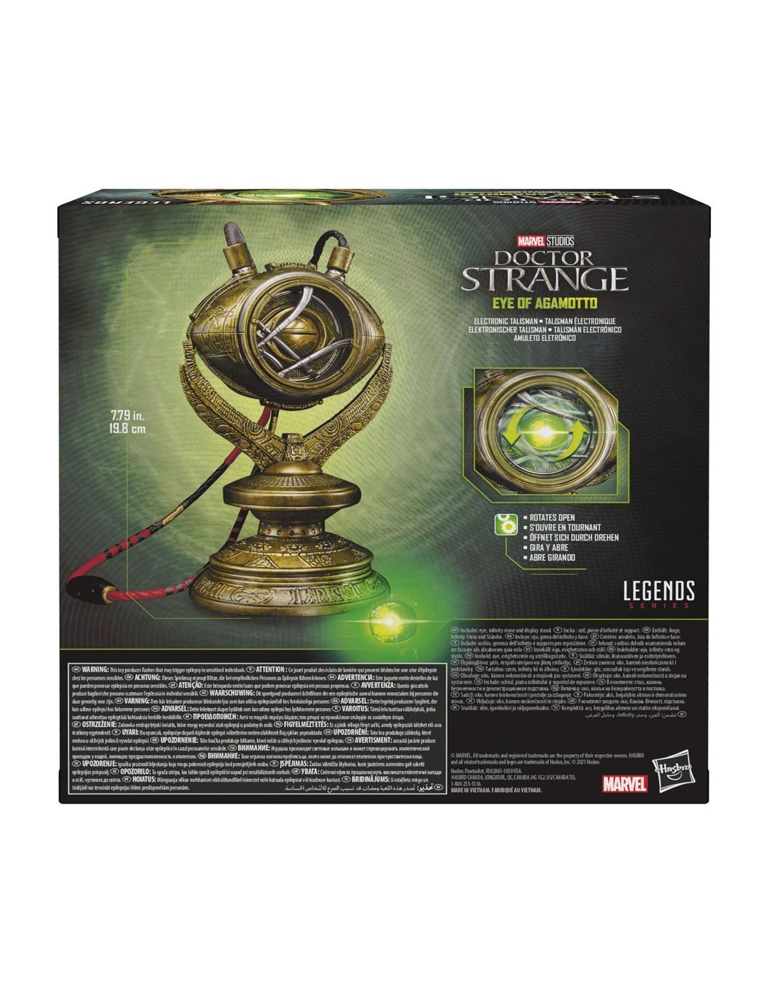 Hasbro Fans presenta esta réplica electrónica del Ojo de Agamotto, el mítico objeto de poder que está en poder del Hechicero Supremo. Se trata de una réplica hecha en PVC a escala 1:1 que permite a su poseedor controlar la Gema del Tiempo. Esta réplica está basada en el diseño del poderoso talismán que el Doctor Extraño utiliza en la película. Brilla con luz LED verde y puede colgarse al cuello. Incluye instrucciones. *Requiere 3x Pilas 1.5V AA ALKALINE (no incluidas).
