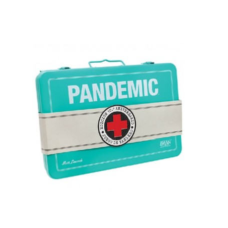 Presentamos esta edición especial de Pandemic para conmemorar el décimo aniversario del juego original que lo comenzó todo. Esta atractiva edición incluye una caja de metal, inspirada en los clásicos botiquines de primeros auxilios. Diseño gráfico completamente nuevo de estética clásica. Figuras de plástico que representan a cada personaje. Indicadores y cubos de madera, como homenaje a la primera edición del juego. Placas de Petri; tarjetas de Personaje y tablero más grandes, para una experiencia más inmersiva.