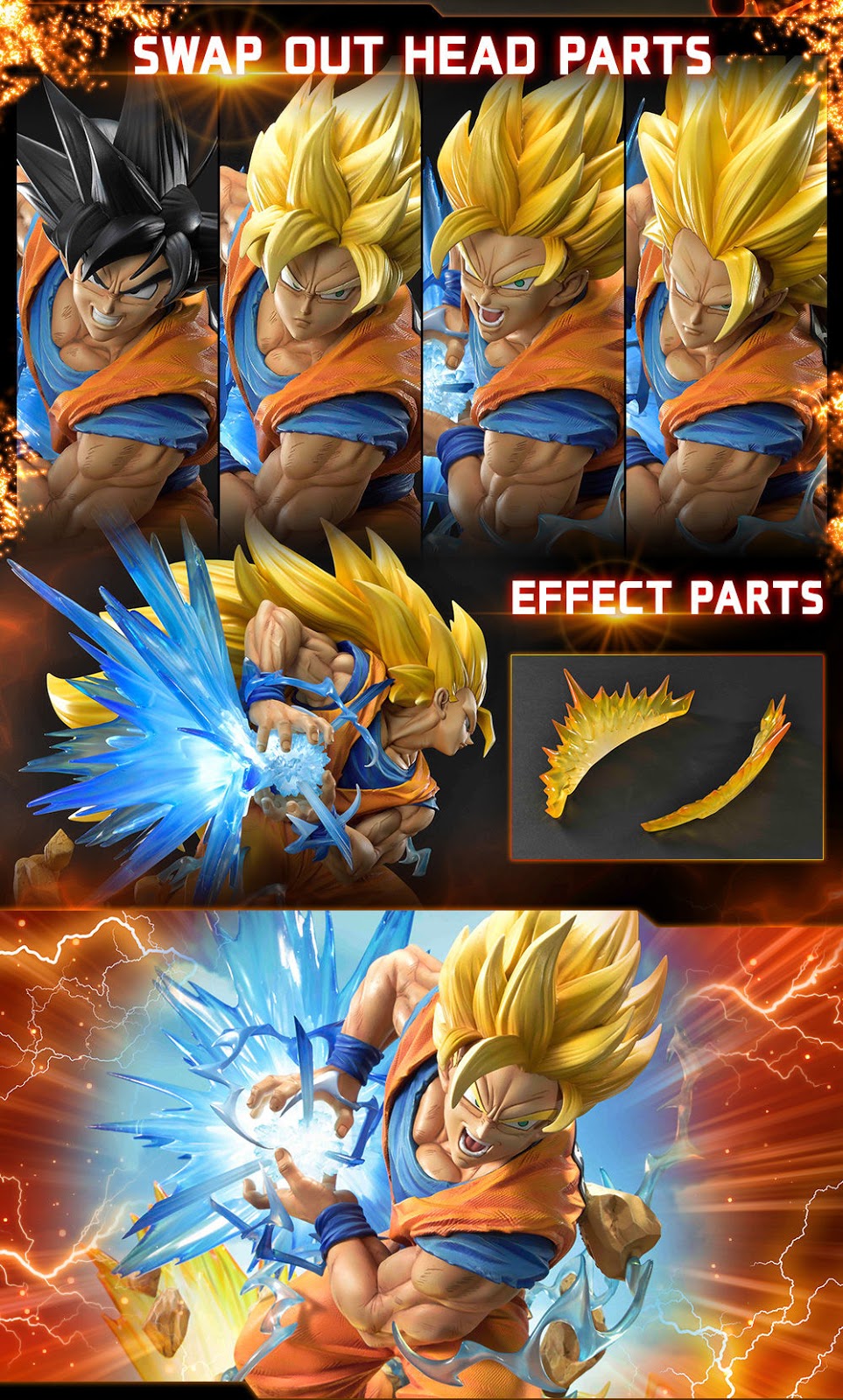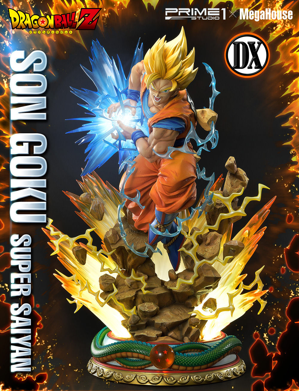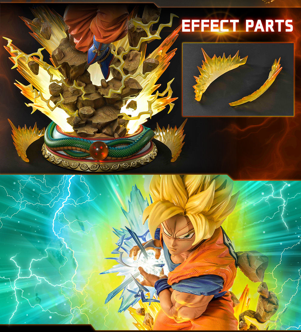 Esta figura es la Versión DX, la cual incluye cabezas intercambiables (Normal, Super Saiyan 2 y Super Saiyan 3), rocas para cuando queráis poner a Son Goku en su estado Normal o en Super Saiyan y partes de efecto para Super Saiyan 2 y Super Saiyan 3.
