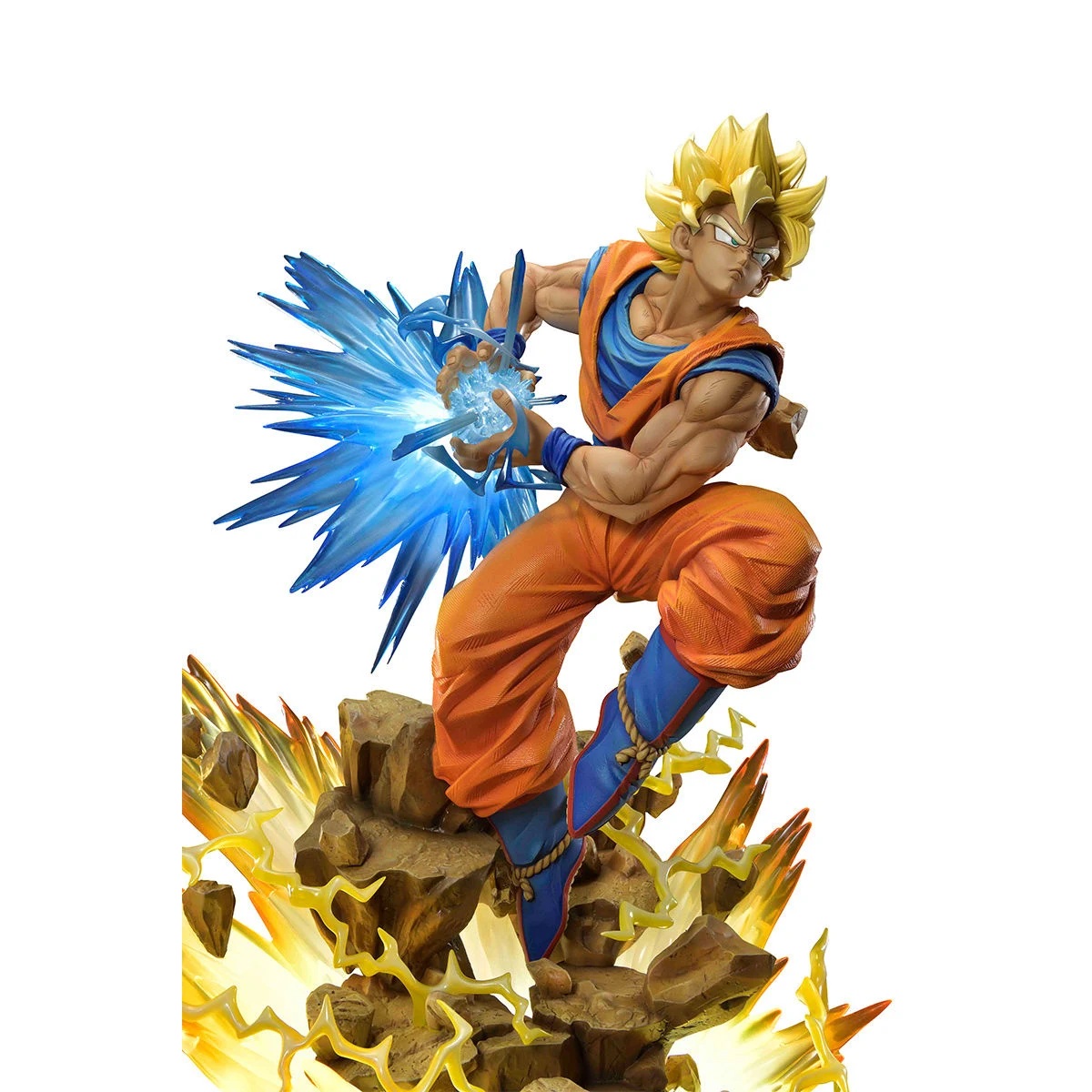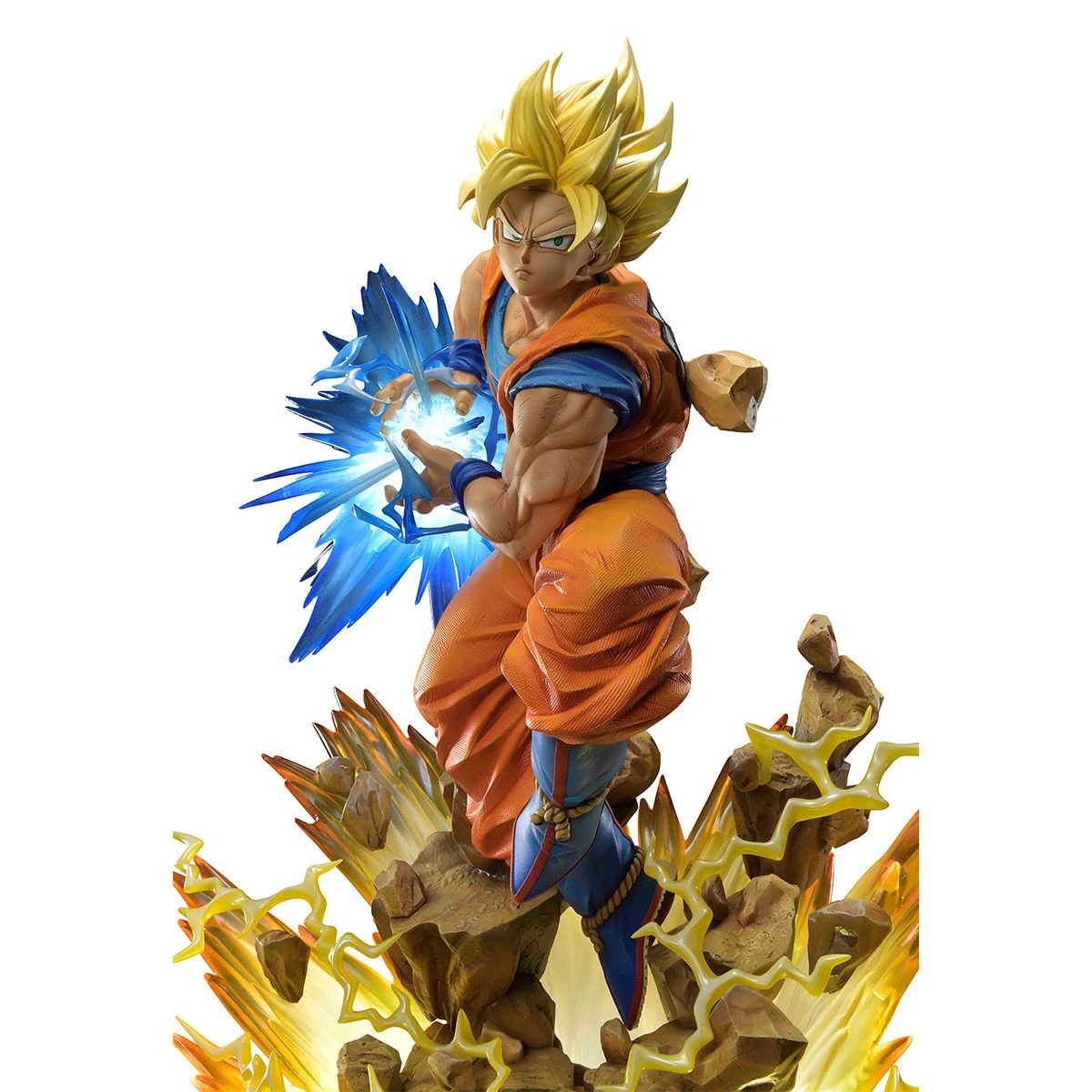 En esta gran estatua, Son Goku ha sido representado transformado en Super Saiyan, como os hemos indicado, y a punto de lanzar un poderoso Kamehameha. Una figura que Prime 1 Studio y MegaHouse nos ofrecen esculpida sin dejarse ni el más mínimo detalle, tanto a nivel de escultura como de pintura, para obtener una estatua de una calidad indiscutible. Fijaos en la pose tan dinámica con la que ha sido representado Son Goku a punto de lanzar su poderoso ataque, la expresión tan dura de su rostro, lo perfectamente recreado que está todo su atuendo, los diferentes efectos recreados con material translúcido para conseguir el mayor realismo posible y la base sobre la que se encuentra y que nos ayuda a adentrarnos en la atmósfera de la batalla.
