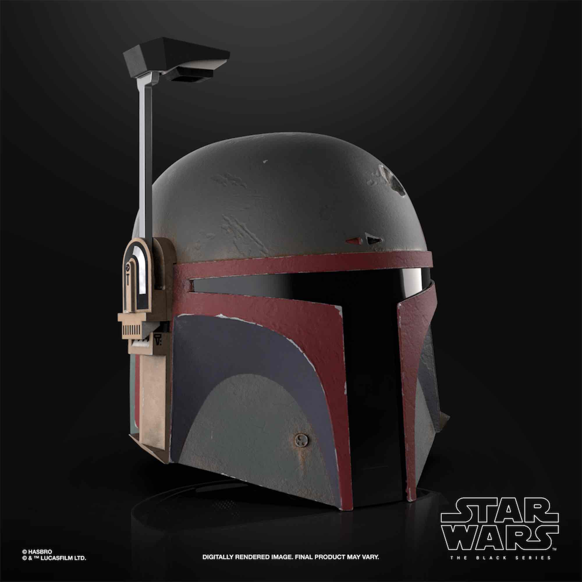 Hasbro presenta dentro de su colección Black Series la réplica del casco del cazarecompensas Boba Fett en su versión repintada tal y como aparece en la serie "The Mandalorian". Se trata de una réplica electrónica escala 1:1 del casco mandaloriano que Boba Fett hizo tan característico. El tamaño es ajustable y el interior está acolchado. Incluye visor que puede bajarse o subirse, luces LED y efectos de rastreo. (Pilas necesarias: x1 1.5v AAA)