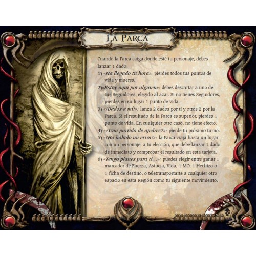 Además, incluye una figura oscura que los jugadores manipulan unos contra otros; La Parca, que se convierte en un nuevo personaje neutral que dificultará más aún la tarea a los aventureros.